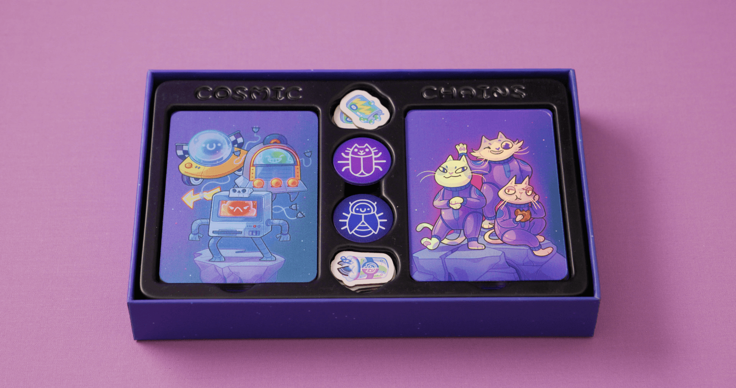 Acrylic tokens, a custom tray, and black core cards with exceptional illustrations of chunky cats and
